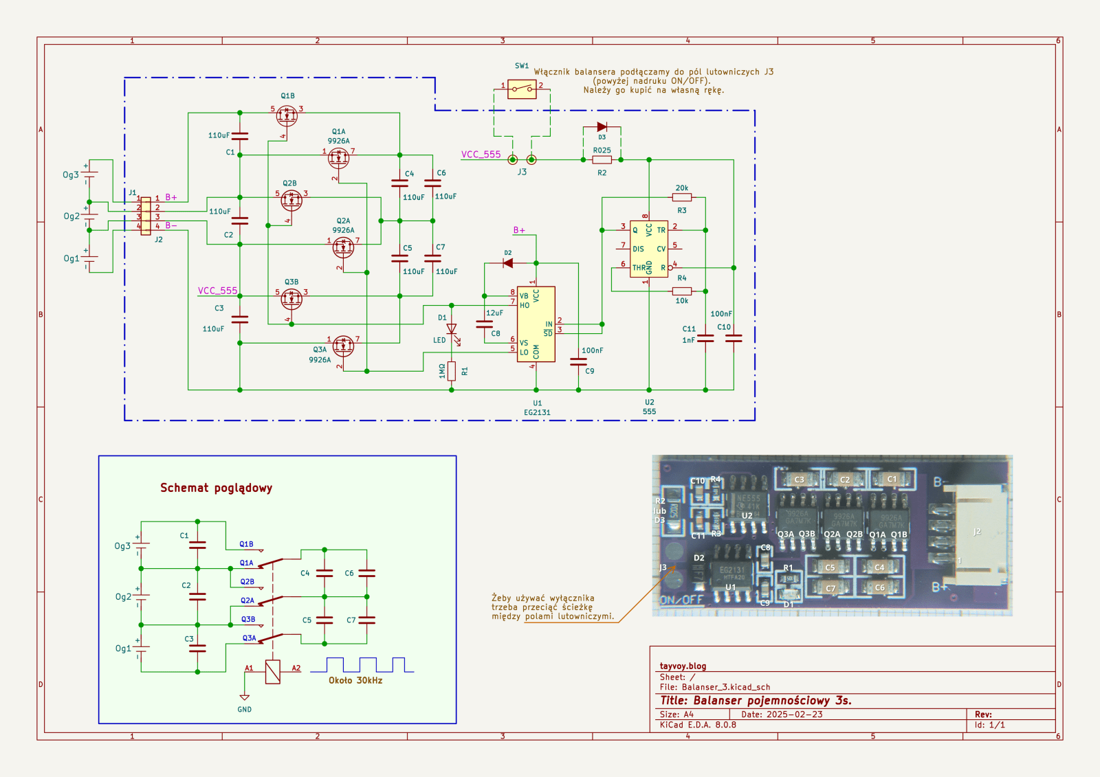 Można użyć zewnętrznego włącznika i załączać/odłączać zasilanie układu 555, wtedy balanser przestaje działać i prąd pobierany przez płytkę spada do poziomu mikroamperów.
