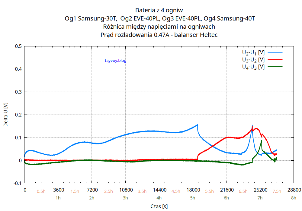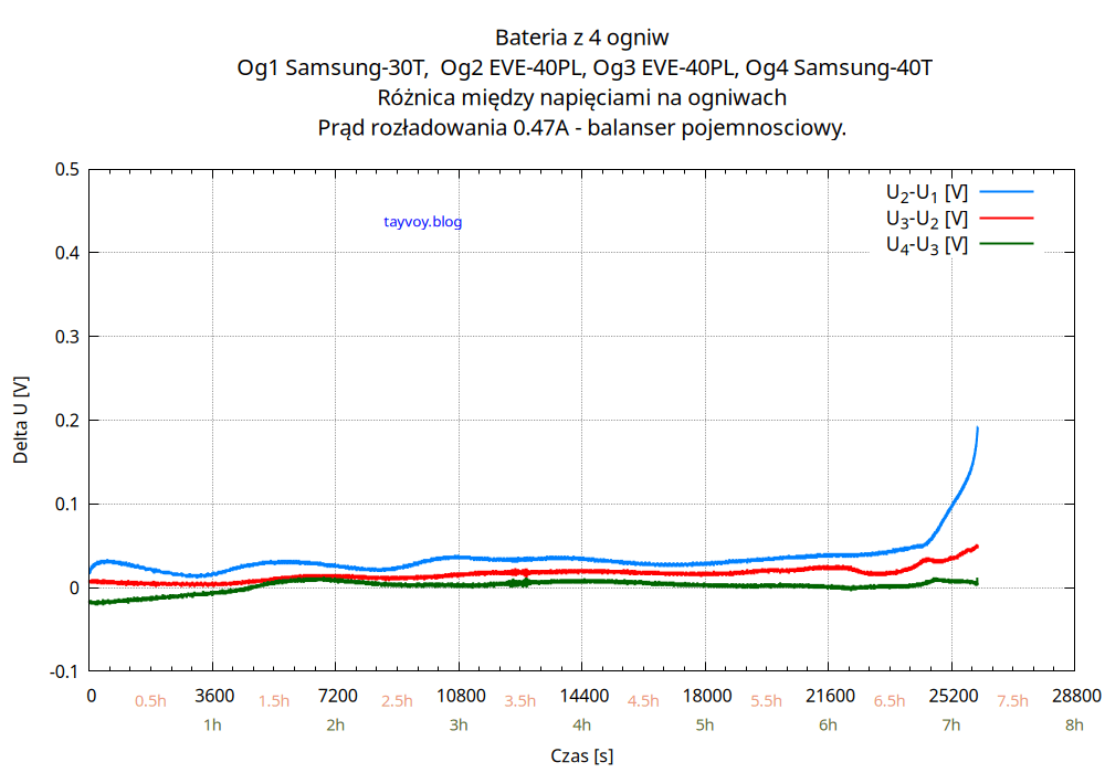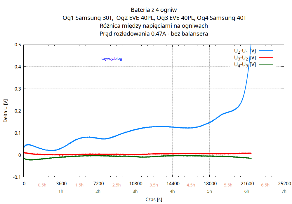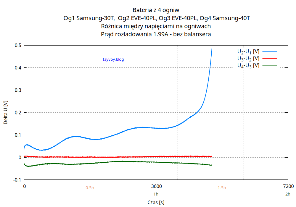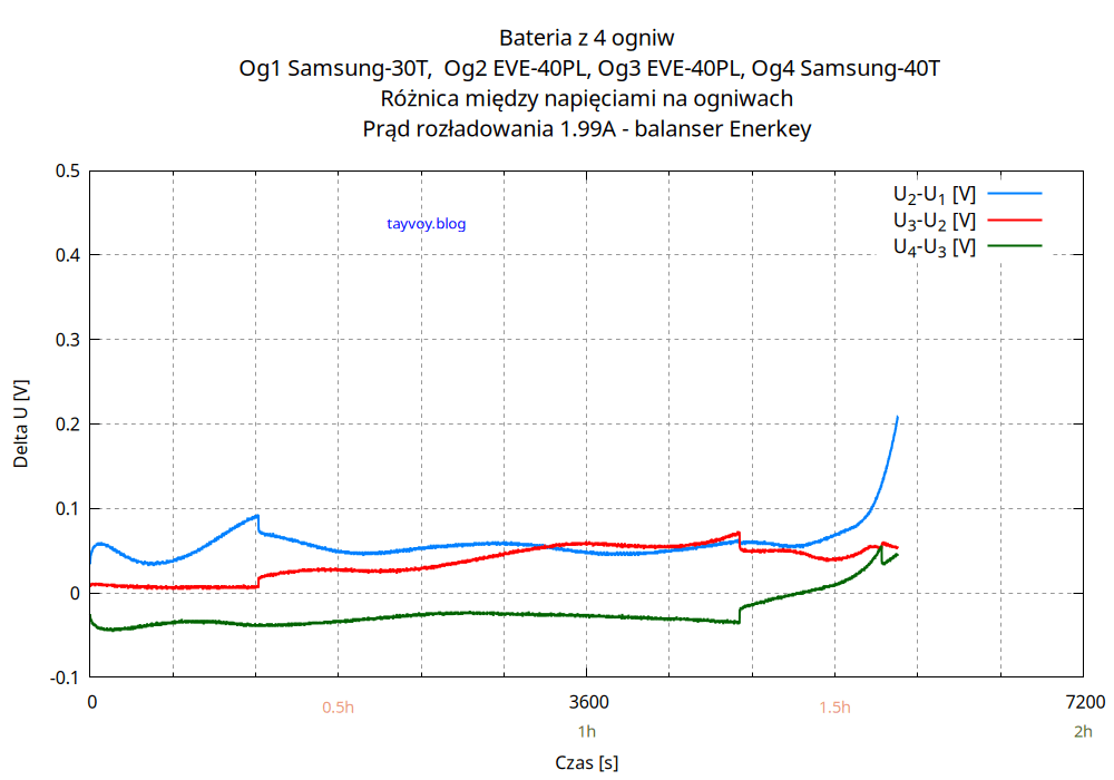Najsłabszym ogniwem w baterii jest oczywiście Samsung 30T, o pojemności mniejszej niż sąsiadujące EVE 40PL o wiecej niż 25%, i podczas rozładowania napięcie na nim spada najszybciej.