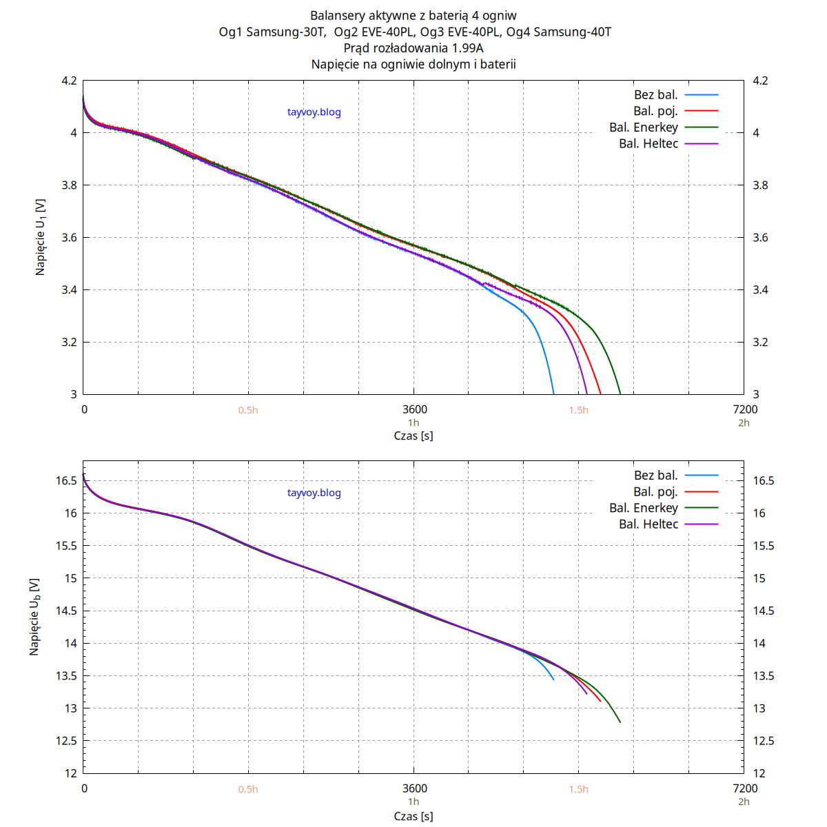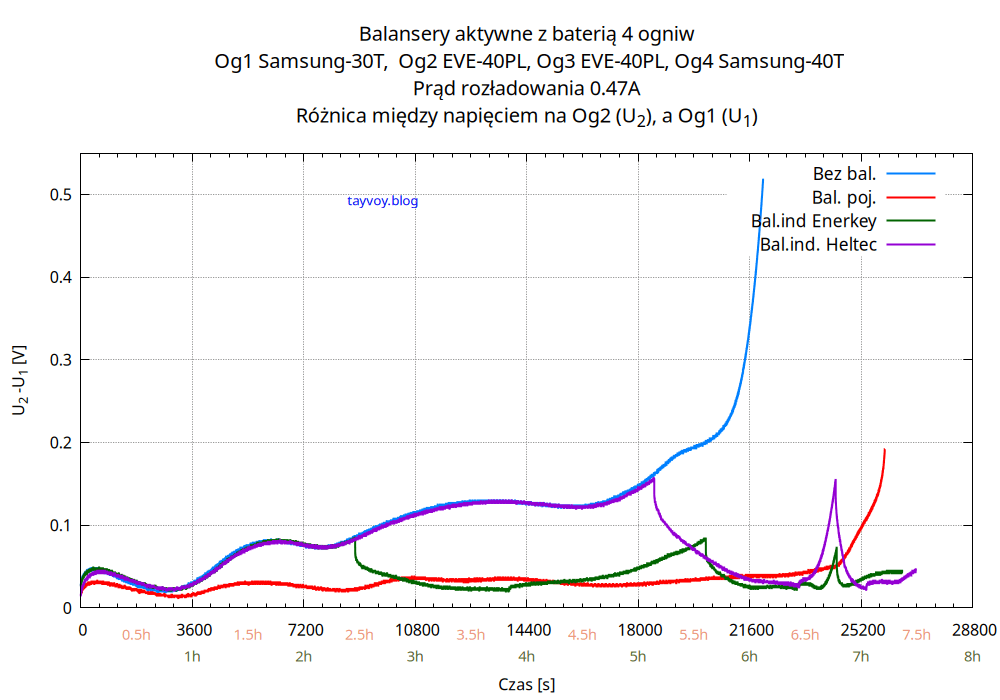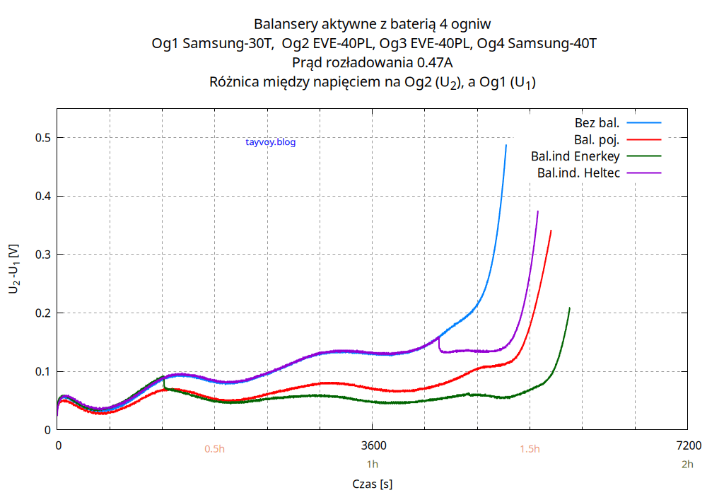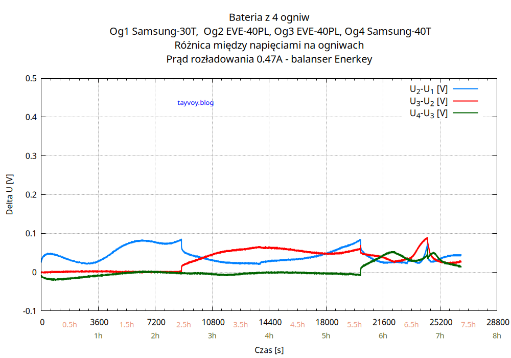 Najsłabszym ogniwem w baterii jest oczywiście Samsung 30T, o pojemności mniejszej niż sąsiadujące EVE 40PL o wiecej niż 25%, i podczas rozładowania napięcie na nim spada najszybciej.