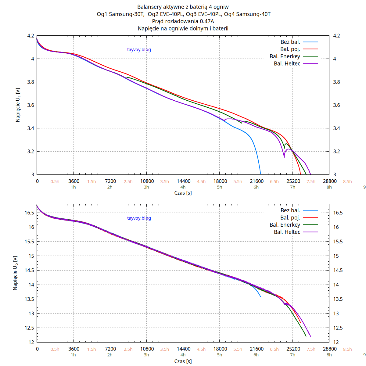 | Balanser | Upocz[V] | Uk[V] | E[Wh] | E[%] | Q[Ah] | Q[%] | Czas |