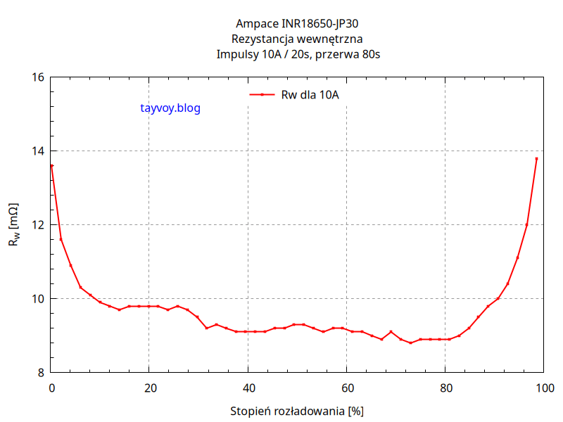 Poniżej wykresy rezystancji wewnętrznej w zależności od stopnia rozładowania ogniwa oraz od napięcia na jego biegunach, mierzona przez rozładowanie impulsami prądu o wartości 10A i czasie trwania 20s.