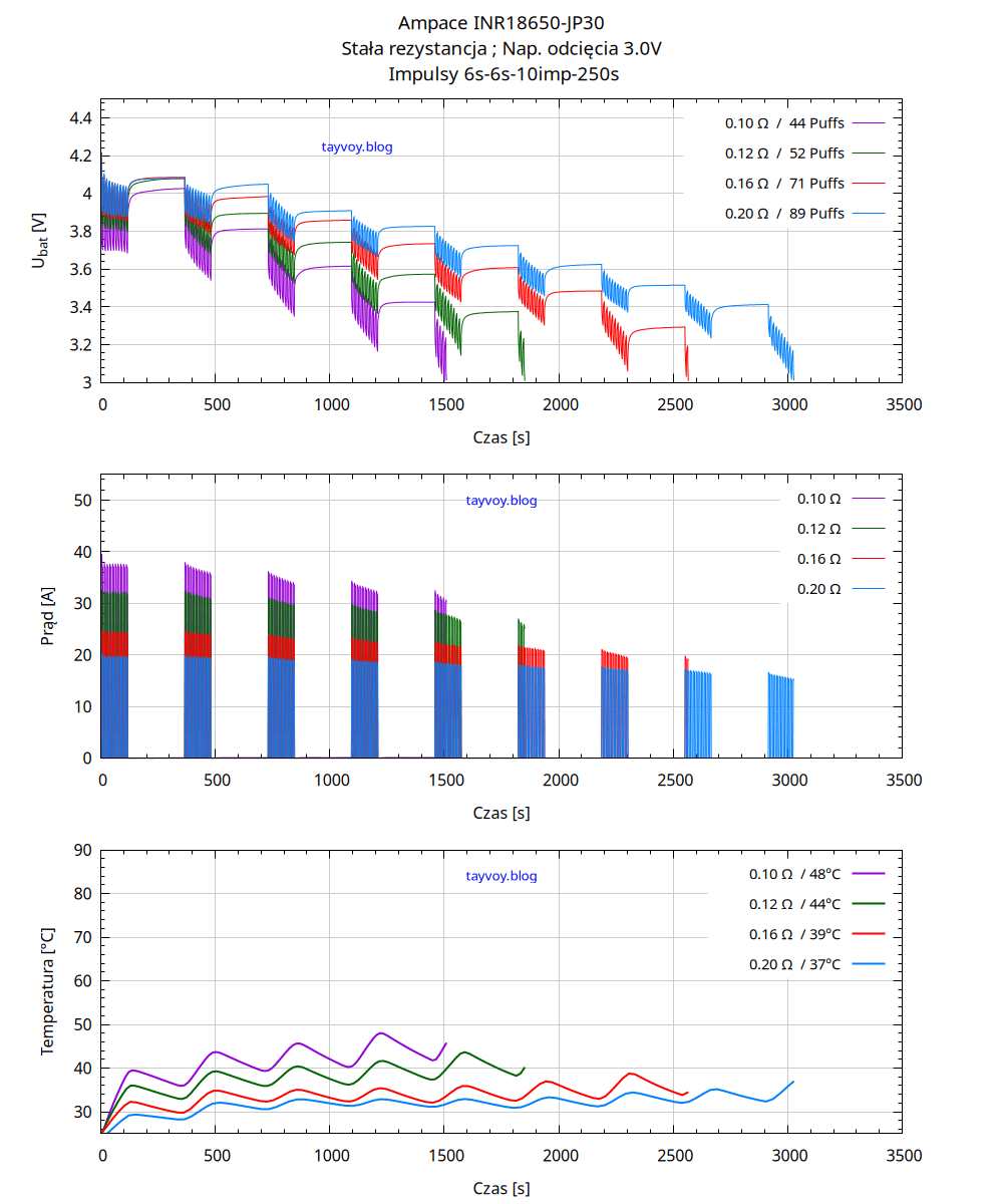 | R [Ω] | Puffs | Q [mAh] | E [Wh] | Im [A] | Tm [°C] |