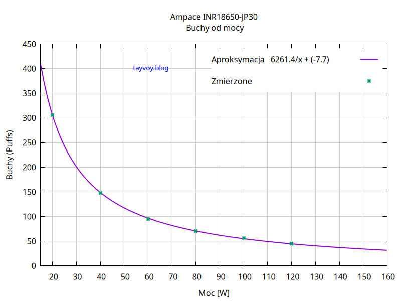 Jeżeli chcemy oszacować ilość umownych buchów dla mocy innej niż była użyta w pomiarach możemy skorzystać z zamieszczonego na wykresie wzoru wstawiając moc w Watach w miejsce „x”.