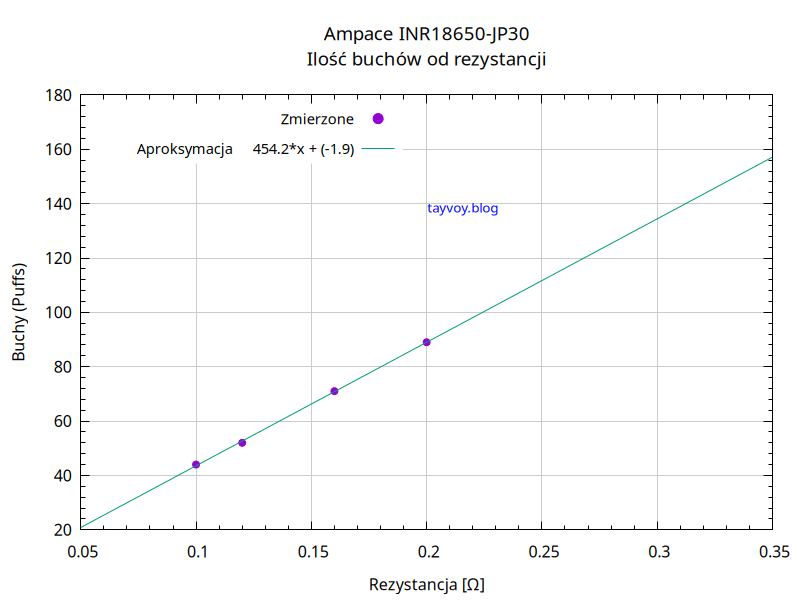 Poniżej wykres pokazujący, że zależność ilości buchów od rezystancji grzałki jest proporcjonalna.