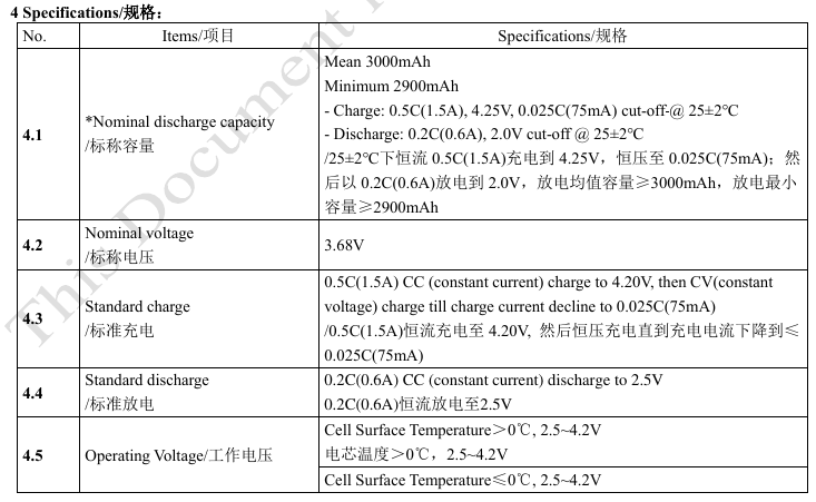 Pojemność ogniwa jest określona przez rozładowanie ogniwa prądem 0,6A, do napięcia 2,0V, w temperaturze otoczenia 25°C.