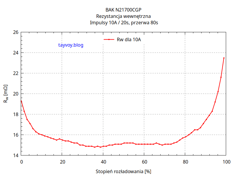 Poniżej wykresy rezystancji wewnętrznej w zależności od stopnia rozładowania ogniwa oraz od napięcia na jego biegunach, mierzona przez rozładowanie impulsami prądu o wartości 10A i czasie trwania 20s.