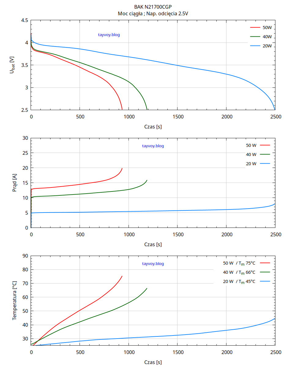 Tabelka niżej zawiera wartości ilości buchów, odebranego ładunku (Q), Energii (E), maksymalnego prądu (Im) oraz najwyższej temperatury w trakcie rozładowania (Tm) dla poszczególnych wartości mocy.