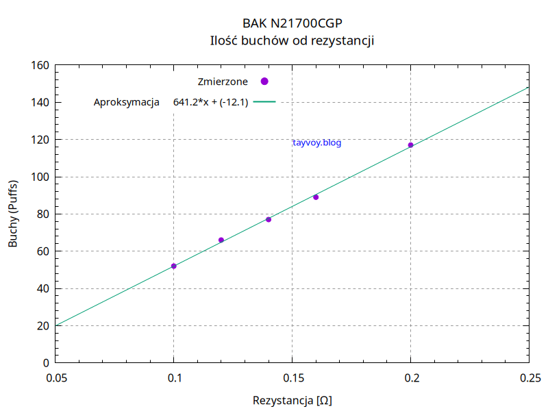 Poniżej wykres pokazujący, że zależność ilości buchów od rezystancji grzałki jest proporcjonalna.