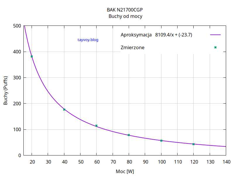 Jeżeli chcemy oszacować ilość umownych buchów dla mocy innej niż była użyta w pomiarach możemy skorzystać z zamieszczonego na wykresie wzoru wstawiając moc w Watach w miejsce „x”.