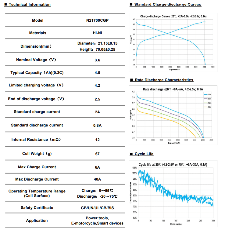 Pojemność ogniwa jest określona przez rozładowanie ogniwa prądem 0.8A, do napięcia 2.5V, w temperaturze otoczenia 25°C. Dopuszczalny ciągły prąd rozładowania to 40A. Powinien być zmniejszony jeśli pracuje ono w obudowie słabo przewodzącej ciepło lub w baterii ogniw, gdzie jest otoczone innymi grzejącymi się ogniwami.