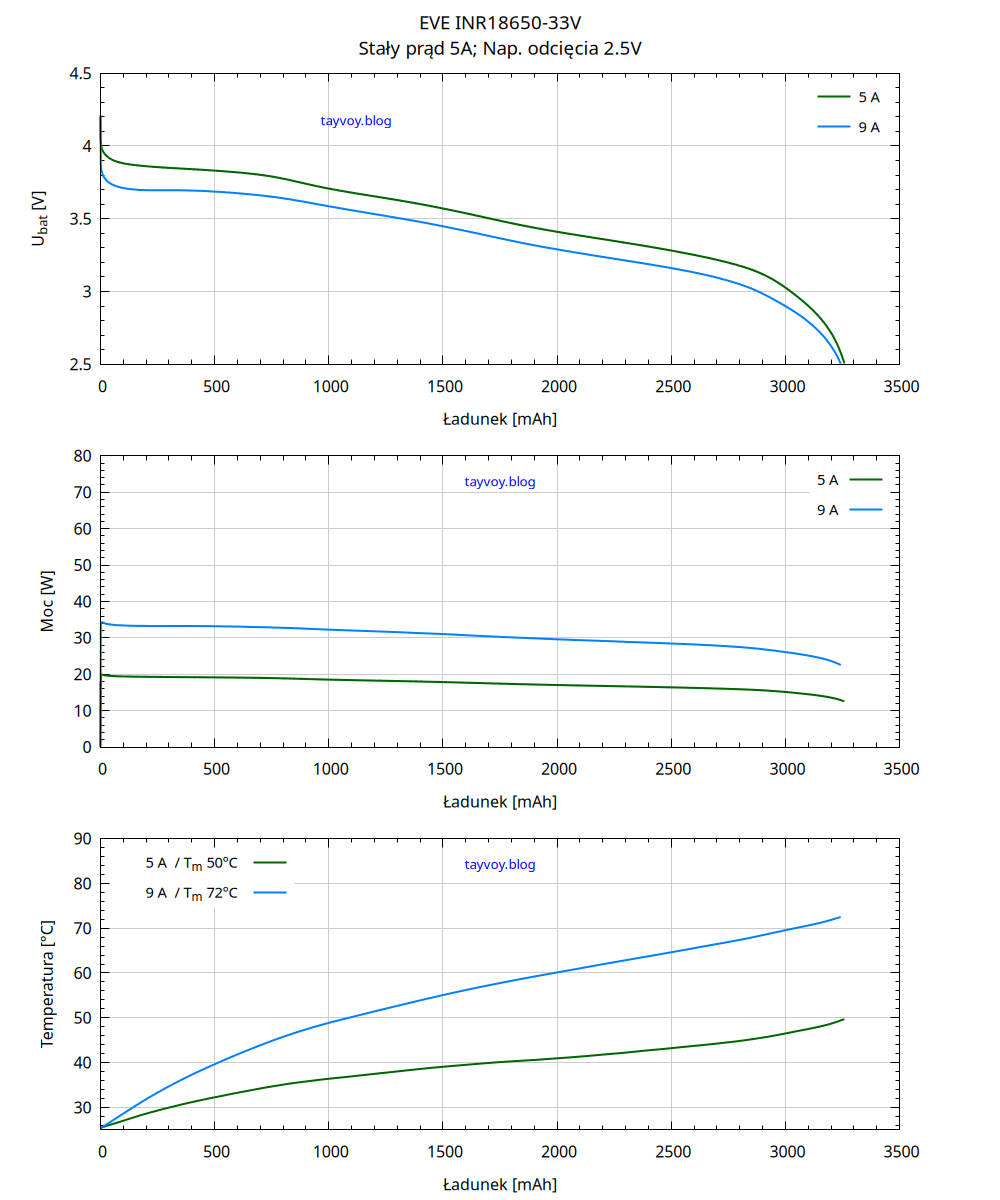 Pojemność (odebrany ładunek) przy prądzie 5A - 3258mAh.