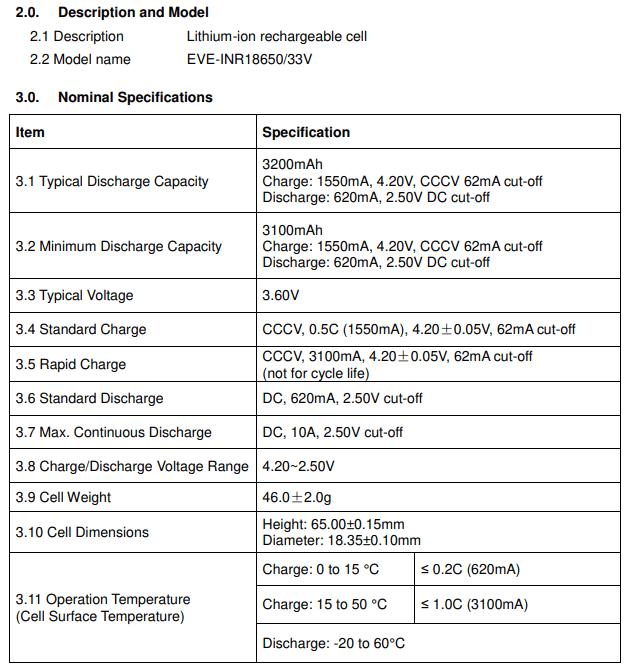 Pojemność znamionowa tego ogniwa (3200mAh) jest określona poprzez rozładowanie go do napięcia 2.5V, prądem o wartości 620mA.