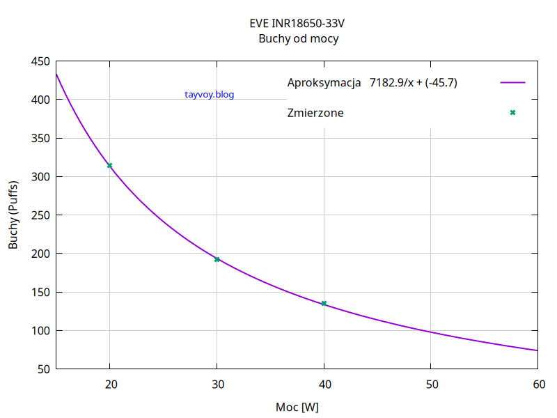 Jeżeli chcemy oszacować ilość umownych buchów dla mocy innej niż była użyta w pomiarach możemy skorzystać z zamieszczonego na wykresie wzoru wstawiając moc w Watach w miejsce „x”.