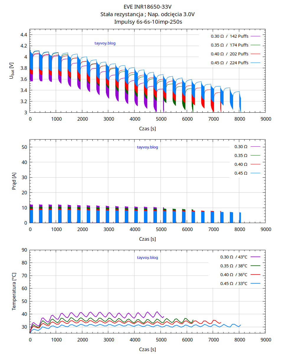| R [Ω] | Puffs | Q [mAh] | E [Wh] | Im [A] | Tm |