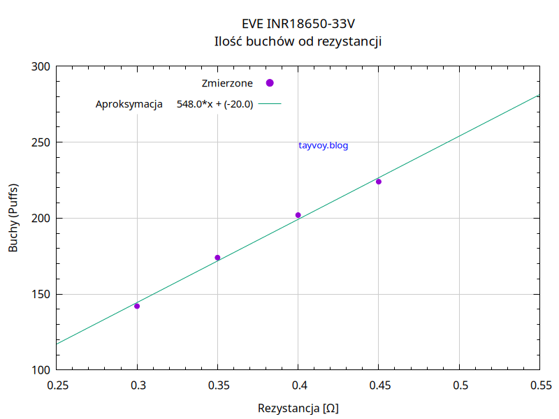 Poniżej wykres pokazujący, że zależność ilości buchów od rezystancji grzałki jest proporcjonalna.