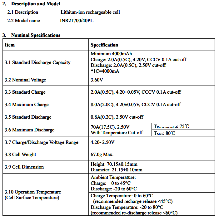 Znamionowy prąd ładowania to 2A, może być ładowane nawet prądem do 8A ale należy kontrolować temperaturę w trakcie ładowania, temperatura powierzchni ogniwa nie można przekroczyć 60°C.