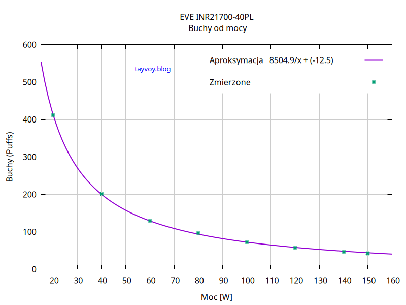Jeżeli chcemy oszacować ilość umownych buchów dla mocy innej niż była użyta w pomiarach możemy skorzystać z zamieszczonego na wykresie wzoru wstawiając moc w Watach w miejsce „x”.