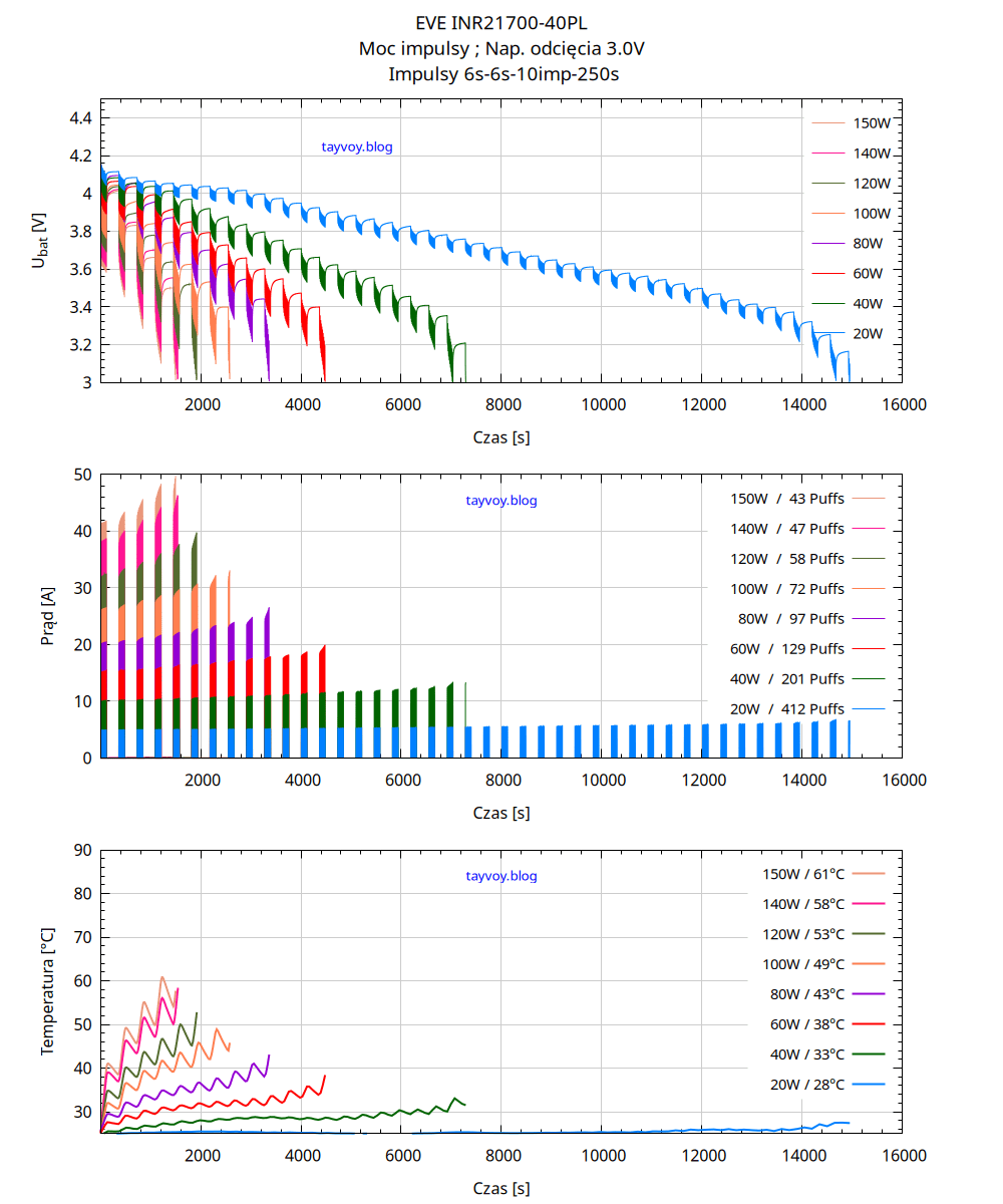 Tabelka niżej zawiera wartości ilości umownych buchów, odebranego ładunku (Q), Energii (E), maksymalnego prądu (Im) oraz najwyższej temperatury w trakcie rozładowania (Tm) dla poszczególnych wartości mocy.