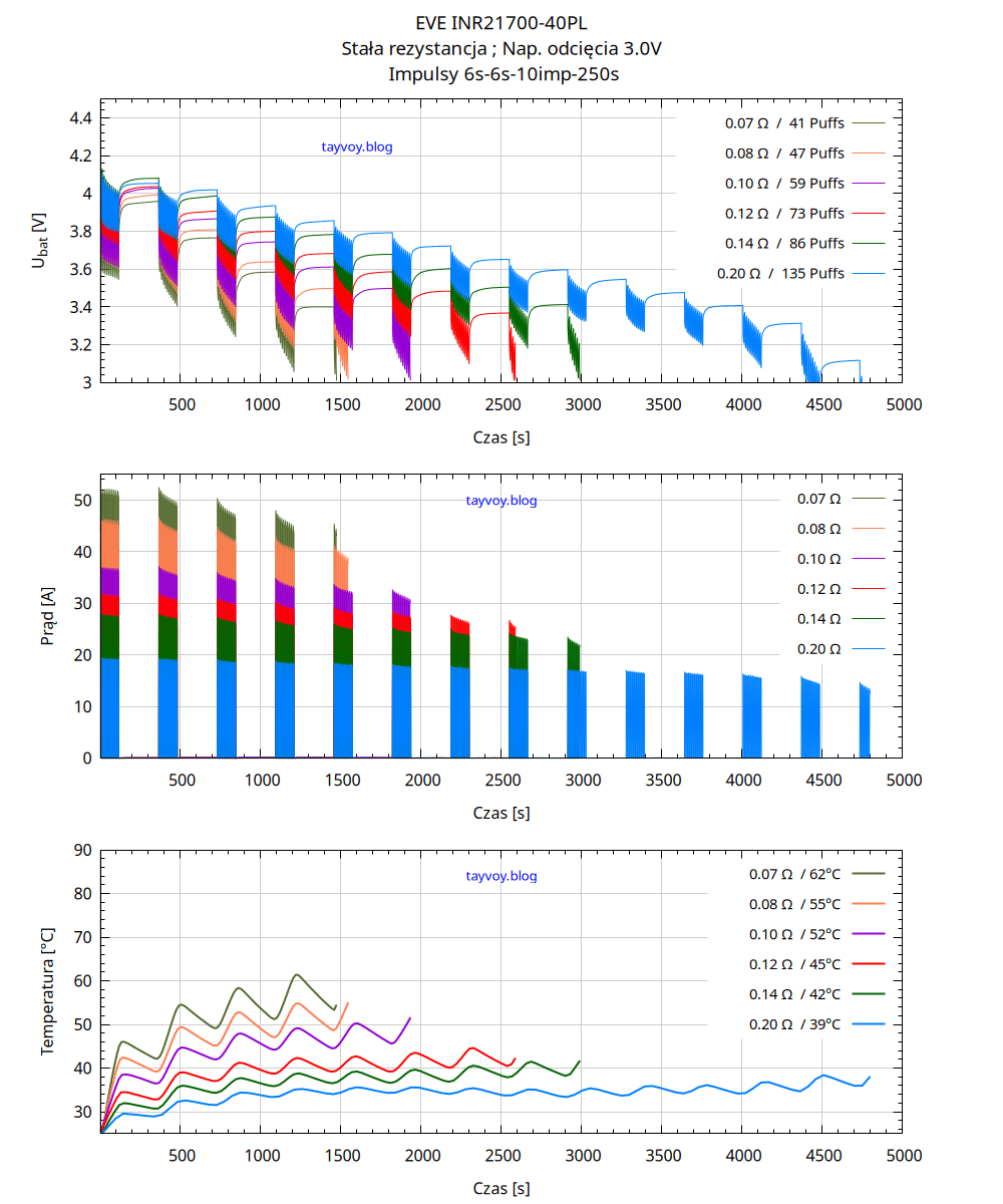 | R [Ω] | Puffs | Q [mAh] | E [Wh] | Im [A] | Tm |