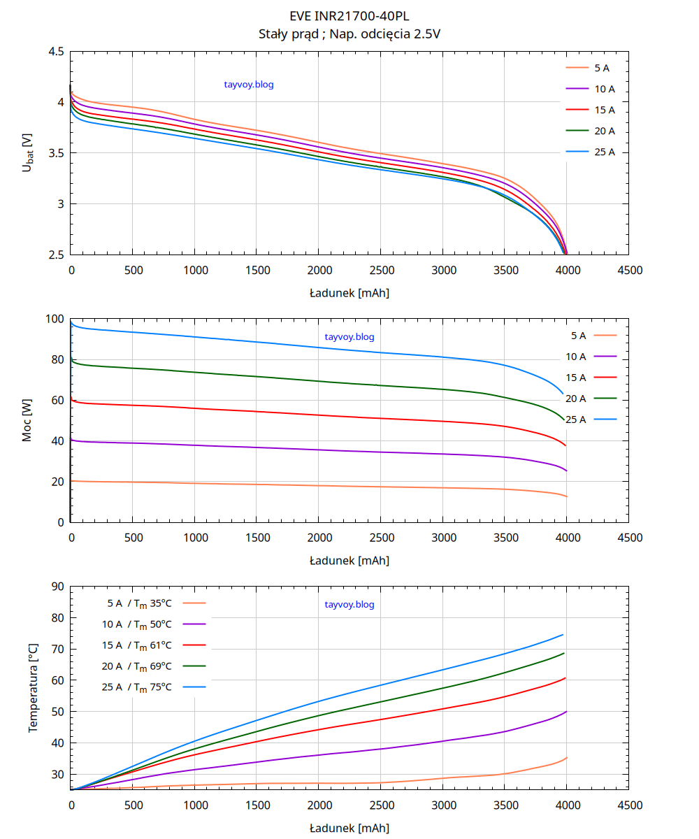 Największy ciągły prąd przy którym temperatura ogniwa nie przekroczyła 75°C - 25A.