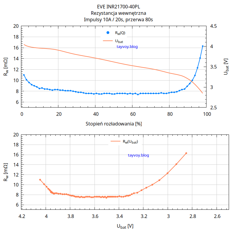 Poniżej wykresy rezystancji wewnętrznej w zależności od stopnia rozładowania ogniwa oraz od napięcia na jego biegunach, mierzonej przez rozładowanie impulsami prądu o wartości 10A i czasie trwania 20s.