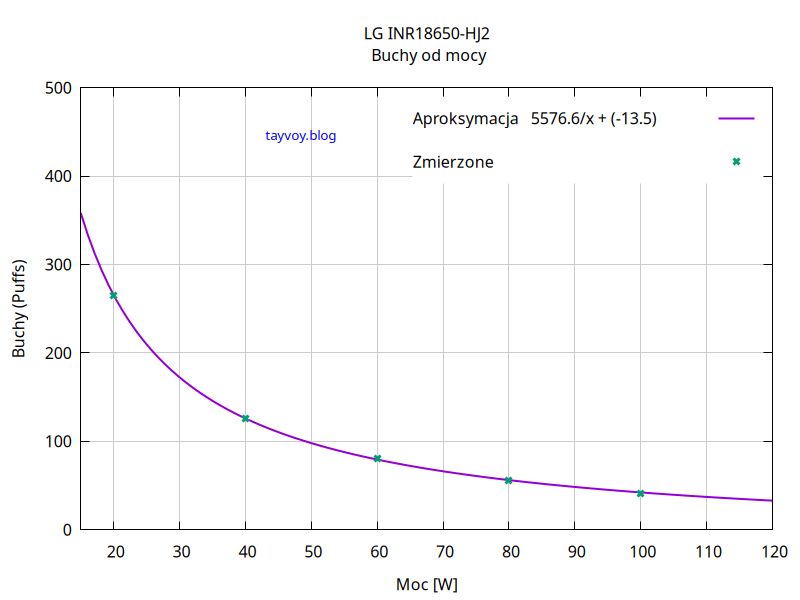 Jeżeli chcemy oszacować ilość umownych buchów dla mocy innej niż była użyta w pomiarach możemy skorzystać z zamieszczonego na wykresie wzoru wstawiając moc w Watach w miejsce „x”.