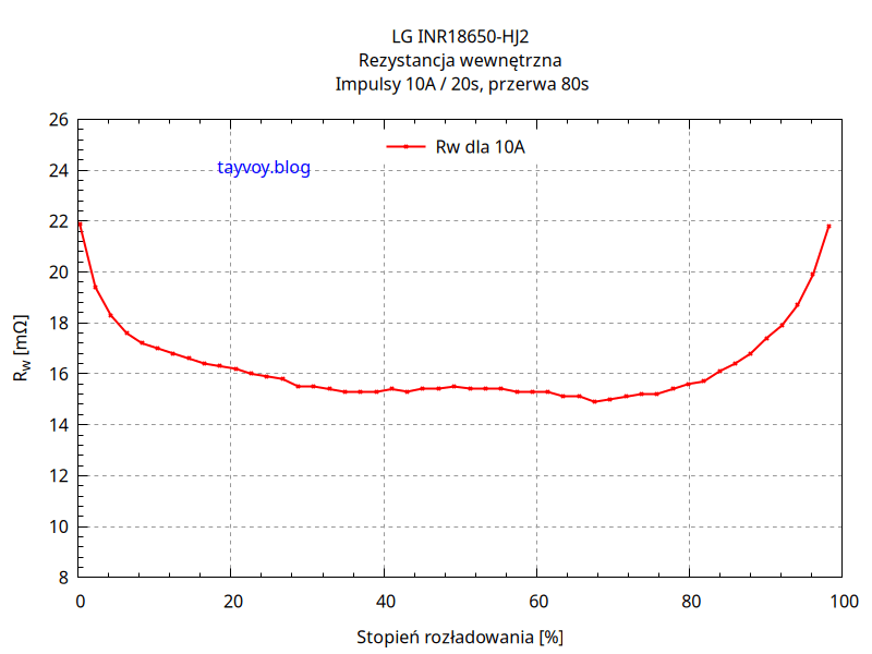 Poniżej wykresy rezystancji wewnętrznej w zależności od stopnia rozładowania ogniwa, mierzonej przez rozładowanie impulsami prądu o wartości 10A i czasie trwania 20s.