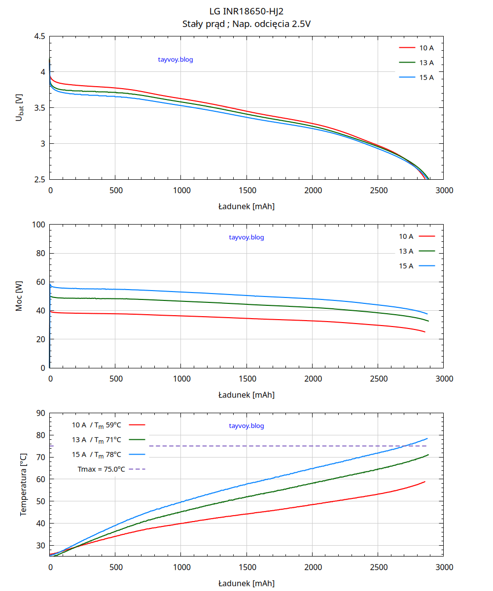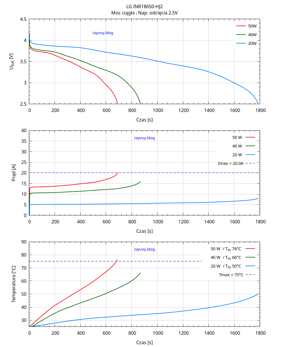 Tmax - przerywana linia pozioma na wykresach temperatury pokazuje największą dopuszczalną temperaturę powierzchni ogniwa podczas rozładowywania.