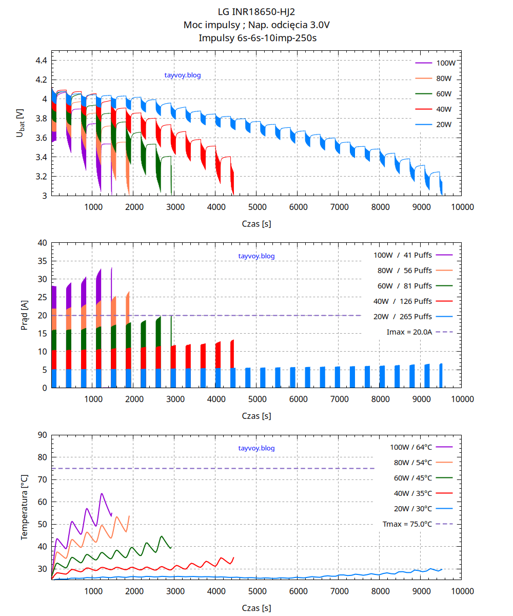 Tabelka niżej zawiera wartości ilości buchów, odebranego ładunku (Q), Energii (E), maksymalnego prądu (Im) oraz najwyższej temperatury w trakcie rozładowania (Tm) dla poszczególnych wartości mocy.