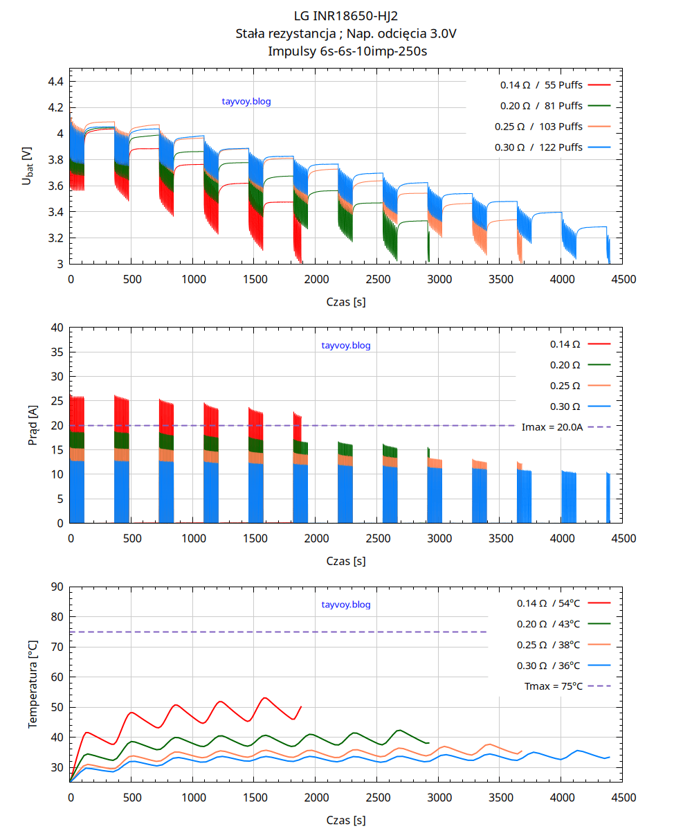 | R [Ω] | Puffs | Q [mAh] | E [Wh] | Im [A] | Tm [°C] |