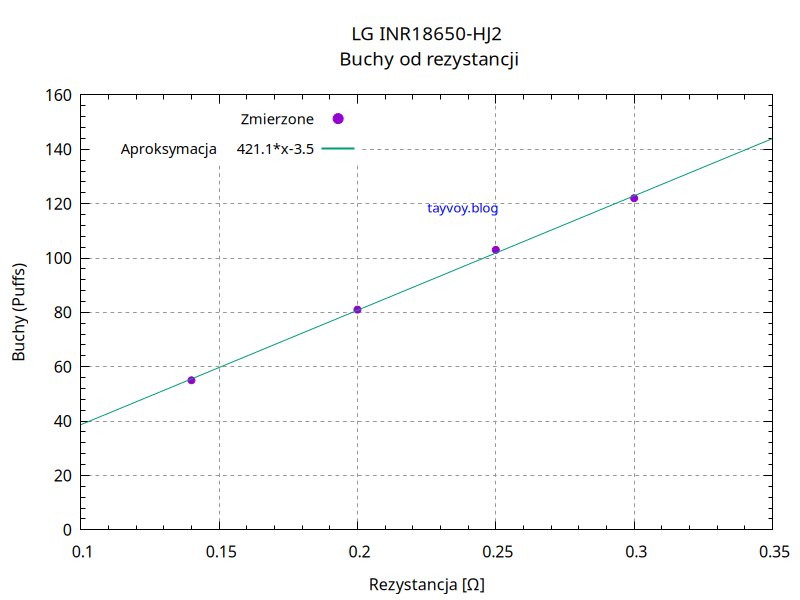 Poniżej wykres pokazujący, że zależność ilości buchów od rezystancji grzałki jest proporcjonalna.