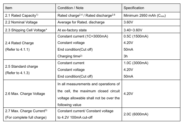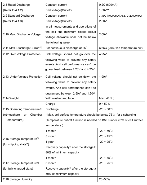 Ogniwo może być rozładowane do 1.5V tylko w celu pomiaru pojemności, normalnie nie należy go rozładowywać poniżej 2.5V.