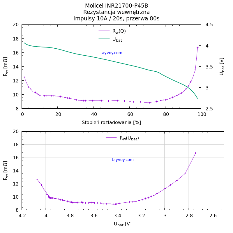Poniżej wykresy rezystancji wewnętrznej w zależności od stopnia rozładowania ogniwa oraz od napięcia na jego biegunach, mierzona przez rozładowanie impulsami prądu o wartości 10A i czasie trwania 20s.