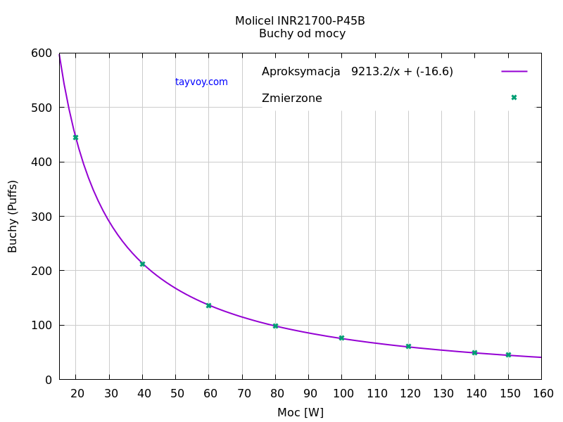 Jeżeli chcemy oszacować ilość umownych buchów dla mocy innej niż była użyta w pomiarach możemy skorzystać z zamieszczonego na wykresie wzoru wstawiając moc w Watach w miejsce „x”.