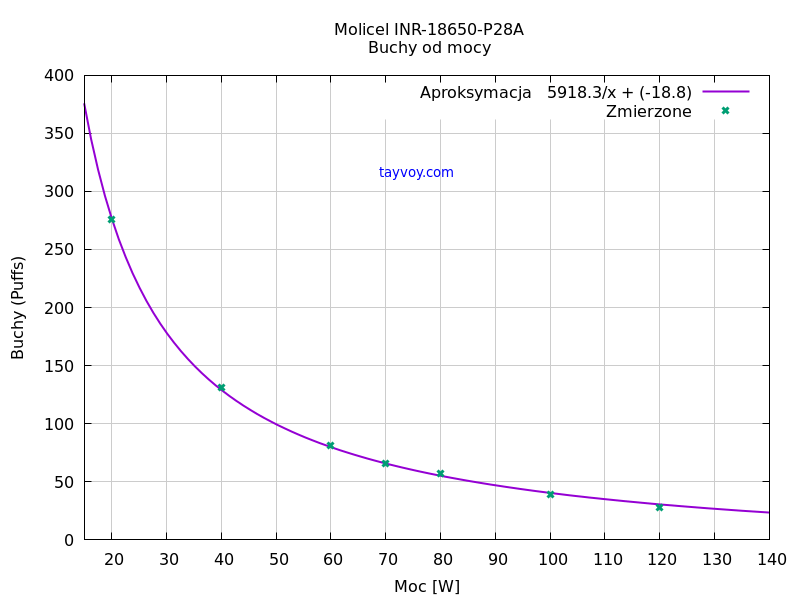 Jeżeli chcemy oszacować ilość umownych buchów dla mocy innej niż była użyta w pomiarach możemy skorzystać z zamieszczonego na wykresie wzoru wstawiając moc w Watach w miejsce „x”.