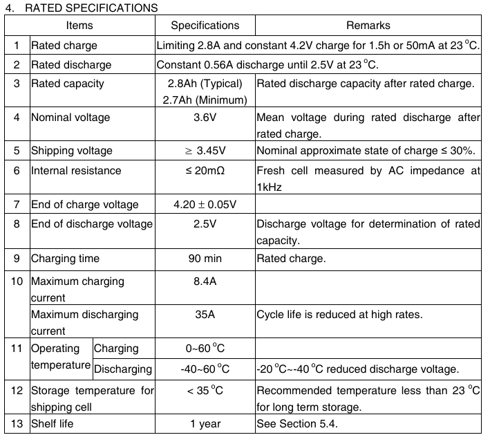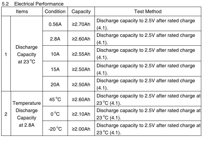 Pojemność znamionowa tego ogniwa (2800mAh) jest określona poprzez rozładowanie go do napięcia 2,5V, prądem o wartości 560mA.