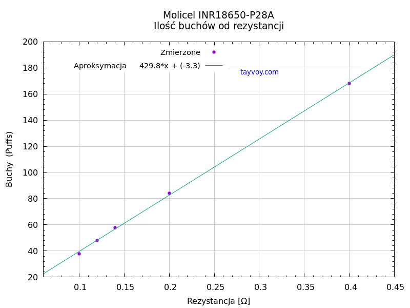 Poniżej wykres pokazujący, że zależność ilości buchów od rezystancji grzałki jest proporcjonalna.