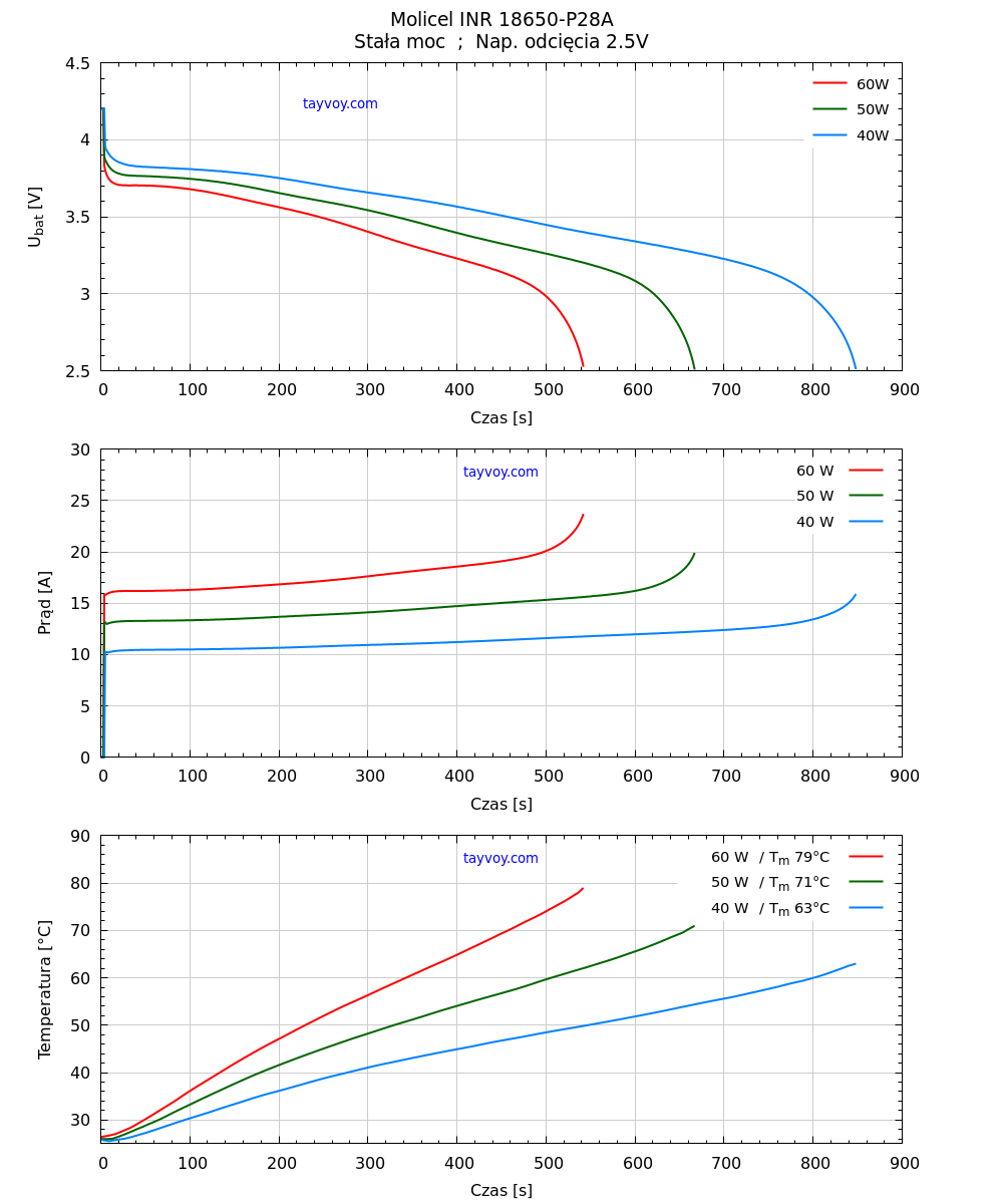 Tabelka niżej zawiera wartości ilości umownych buchów, odebranego ładunku (Q), Energii (E), maksymalnego prądu (Im) oraz najwyższej temperatury w trakcie rozładowania (Tm) dla poszczególnych wartości mocy.