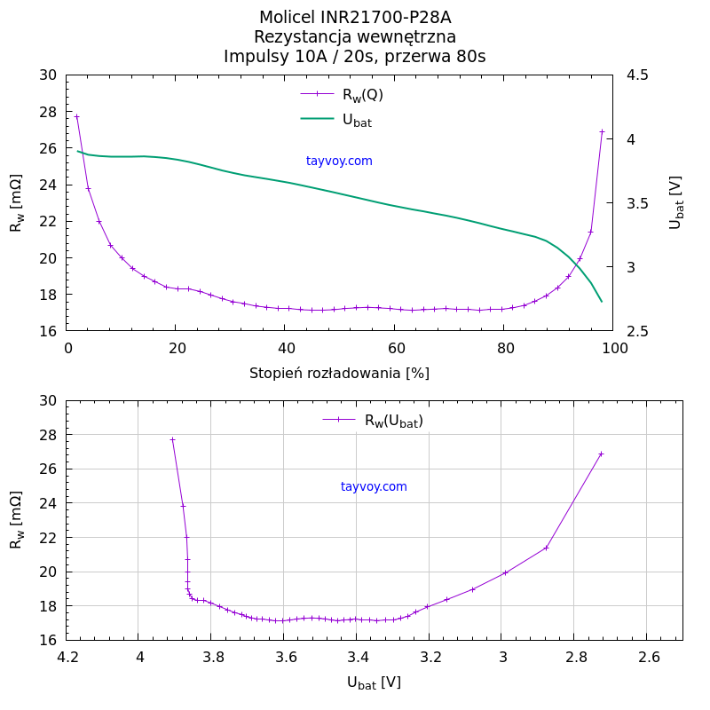 Poniżej wykresy rezystancji wewnętrznej w zależności od stopnia rozładowania ogniwa oraz od napięcia na jego biegunach, mierzona przez rozładowanie impulsami prądu o wartości 10A i czasie trwania 20s.