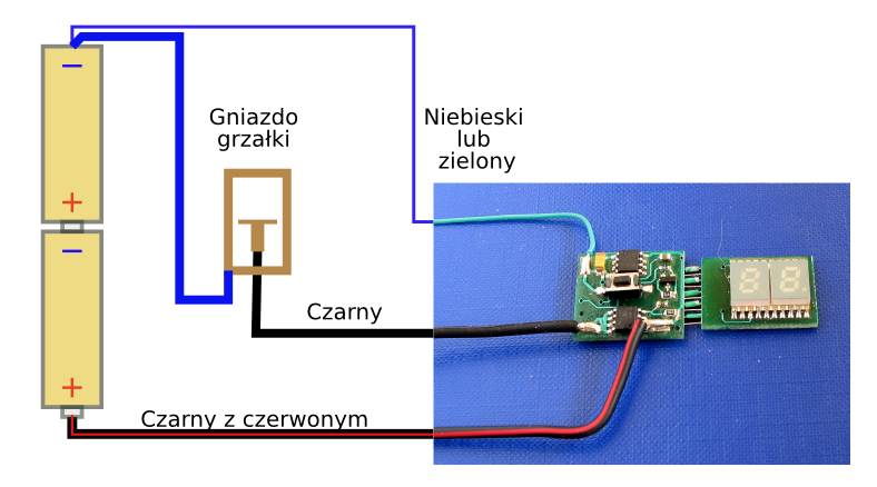 - – Cienki niebieski (lub zielony) z płytki do MINUSA obejmy ogniw