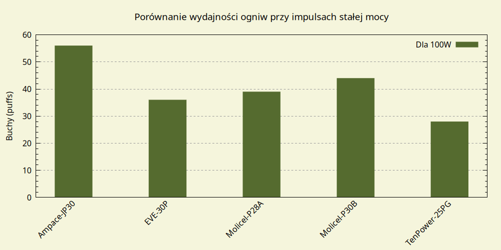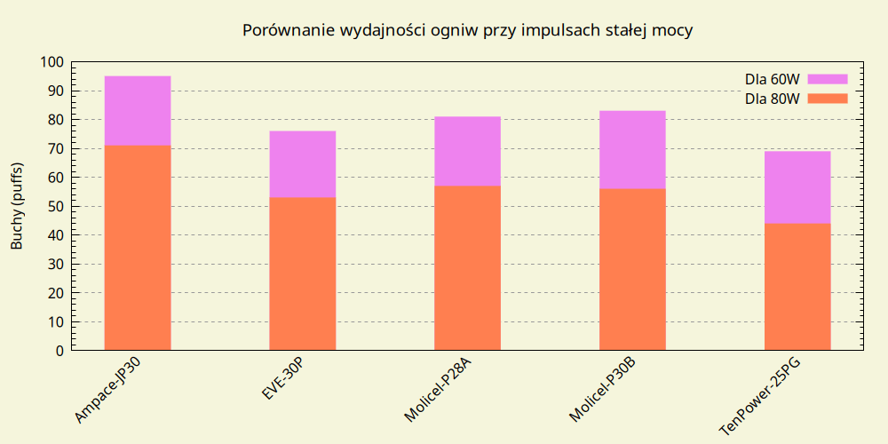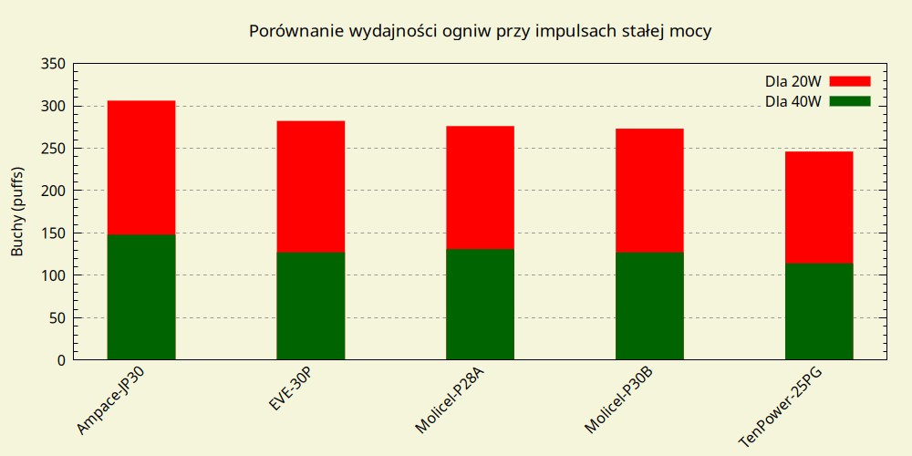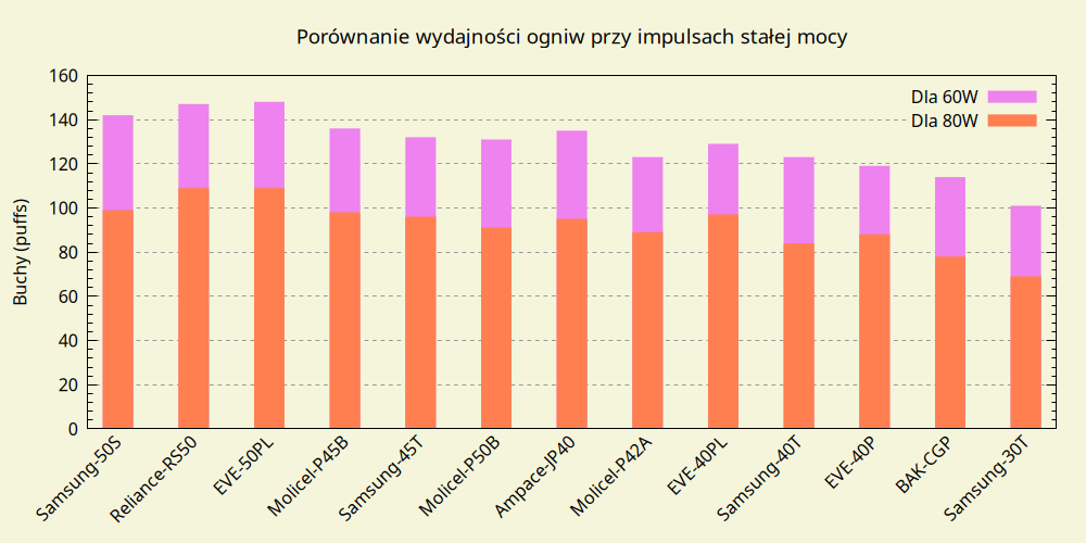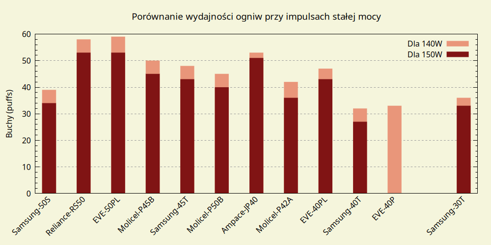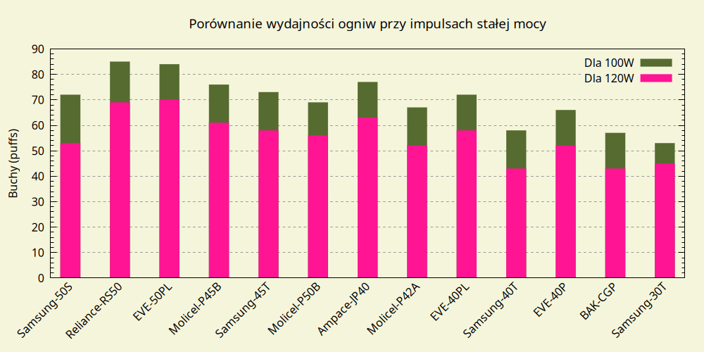 Powyżej 40W dominuje EVE 50PL, do 80W drugi jest Samsung 50S, po czym ustępuje miejsca Molicel P45B, któremu prawie dorównuje Ampace JP40, mimo pojemności mniejszej o prawie 11%.