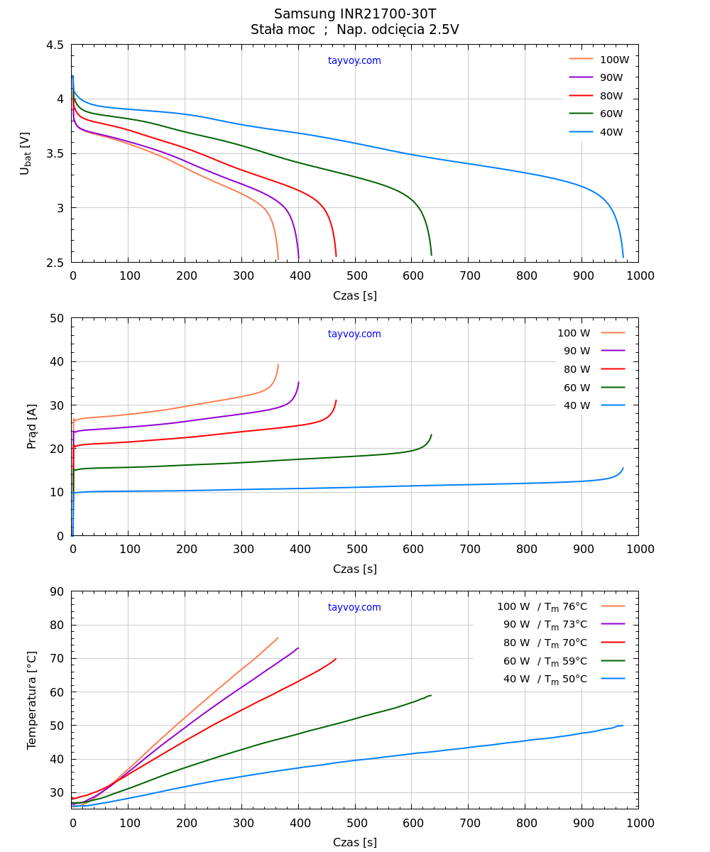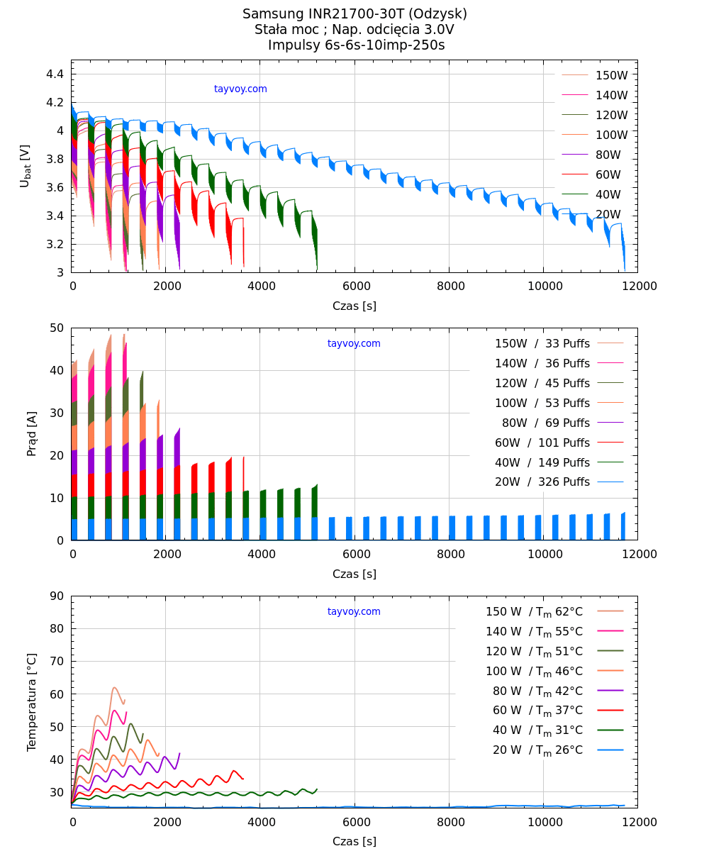 Tabelka niżej zawiera wartości ilości umownych buchów, odebranego ładunku (Q), Energii (E), maksymalnego prądu (Im) oraz najwyższej temperatury w trakcie rozładowania (Tm) dla poszczególnych wartości mocy.
