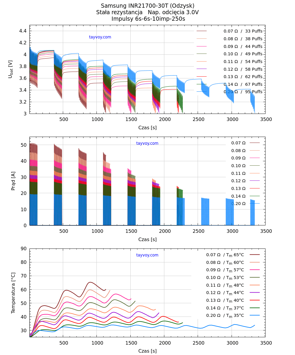 | R [Ω] | Puffs | Q [mAh] | E [Wh] | Im [A] | Tm[°C] |