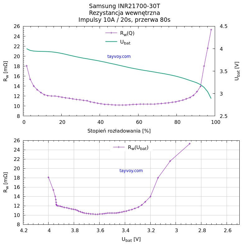 Poniżej wykresy rezystancji wewnętrznej w zależności od stopnia rozładowania ogniwa oraz od napięcia na jego biegunach, mierzona przez rozładowanie impulsami prądu o wartości 10A i czasie trwania 20s.