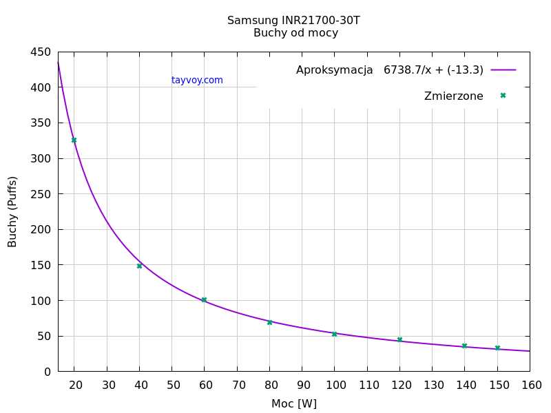 Jeżeli chcemy oszacować ilość umownych buchów dla mocy innej niż była użyta w pomiarach możemy skorzystać z zamieszczonego na wykresie wzoru wstawiając moc w Watach w miejsce „x”.