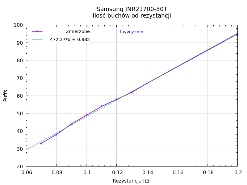 Poniżej wykres pokazujący, że zależność ilości buchów od rezystancji grzałki jest proporcjonalna.