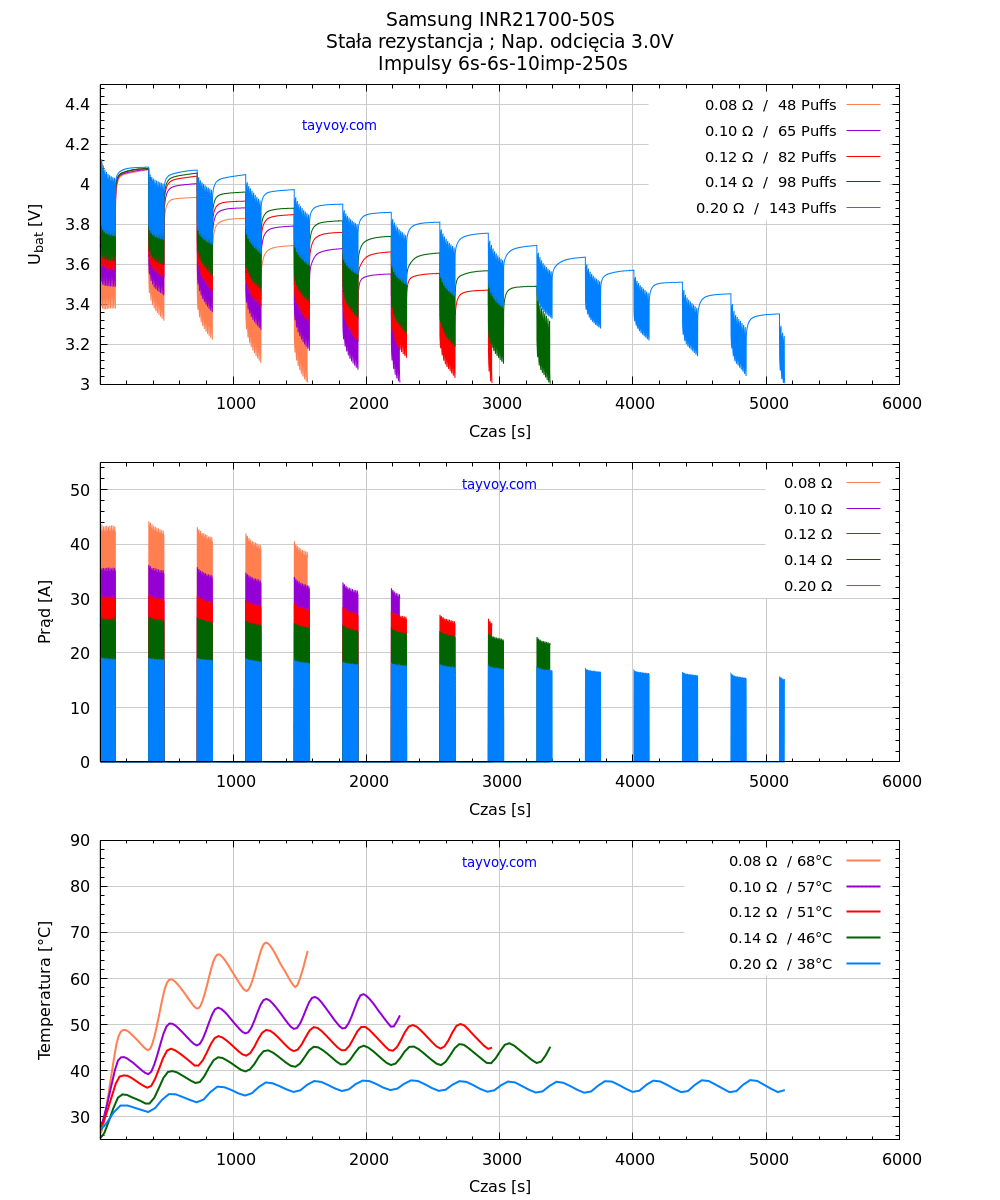 | R [Ω] | Puffs | Q [mAh] | E [Wh] | Im [A] | Tm |