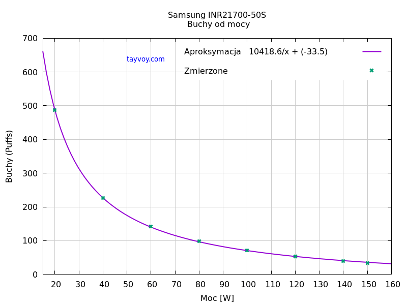 Jeżeli chcemy oszacować ilość umownych buchów dla mocy innej niż była użyta w pomiarach możemy skorzystać z zamieszczonego na wykresie wzoru wstawiając moc w Watach w miejsce „x”.
