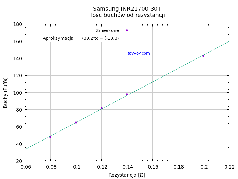 Poniżej wykres pokazujący że zależność ilości buchów od rezystancji grzałki jest proporcjonalna.