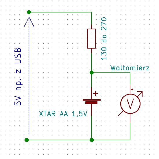 Do tego celu potrzebne jest źródło napięcia 4,7V do 5,2V (wystarczające jest to, co daje port USB lub zwykły powerbank), rezystor, jakiś koszyk na ogniwo AA i woltomierz.